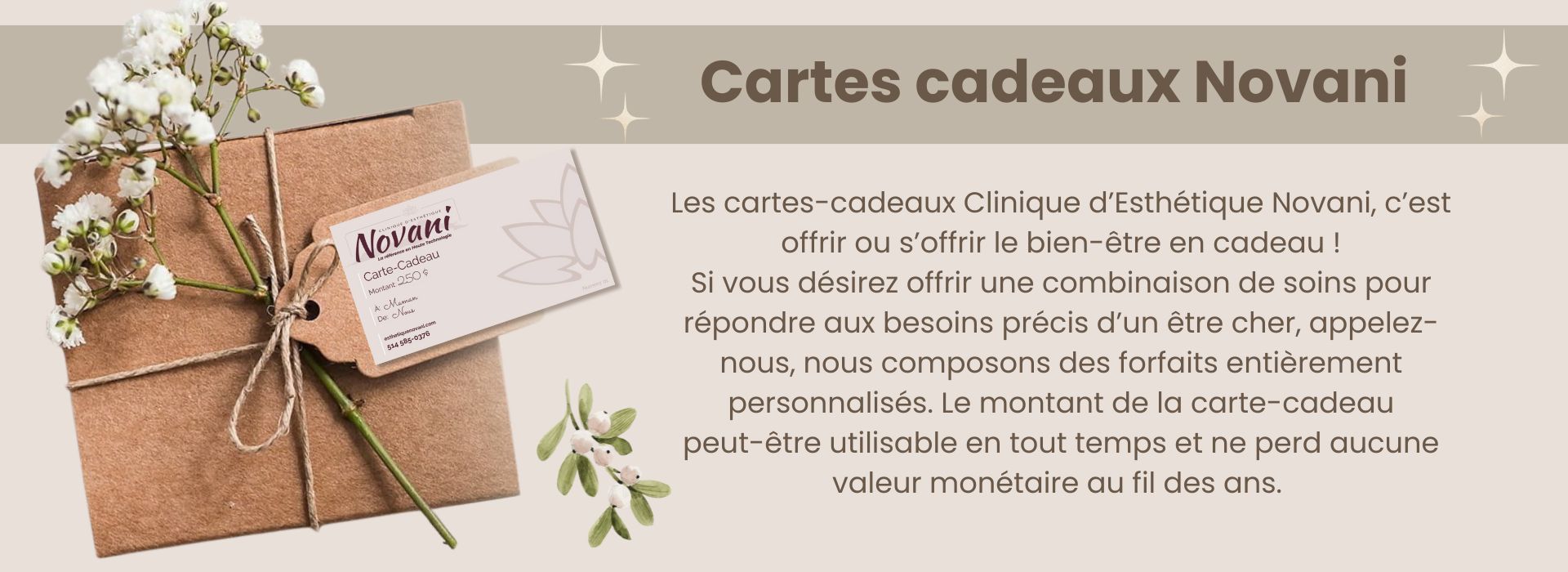 Offrez une carte-cadeau de la Clinique d’Esthétique Novani ! Valable pour tous nos produits et services, choisissez le montant souhaité. La personne pourra sélectionner librement parmi nos offres. Utilisable à tout moment, sans limite de temps ! Achetez-la dès maintenant en ligne, par téléphone ou en clinique!